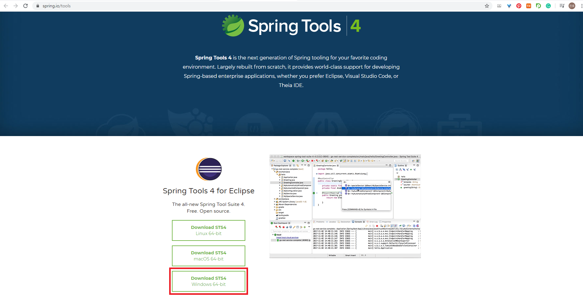 Spring Tools 4 for Eclipse 다운로드 사이트 바로가기