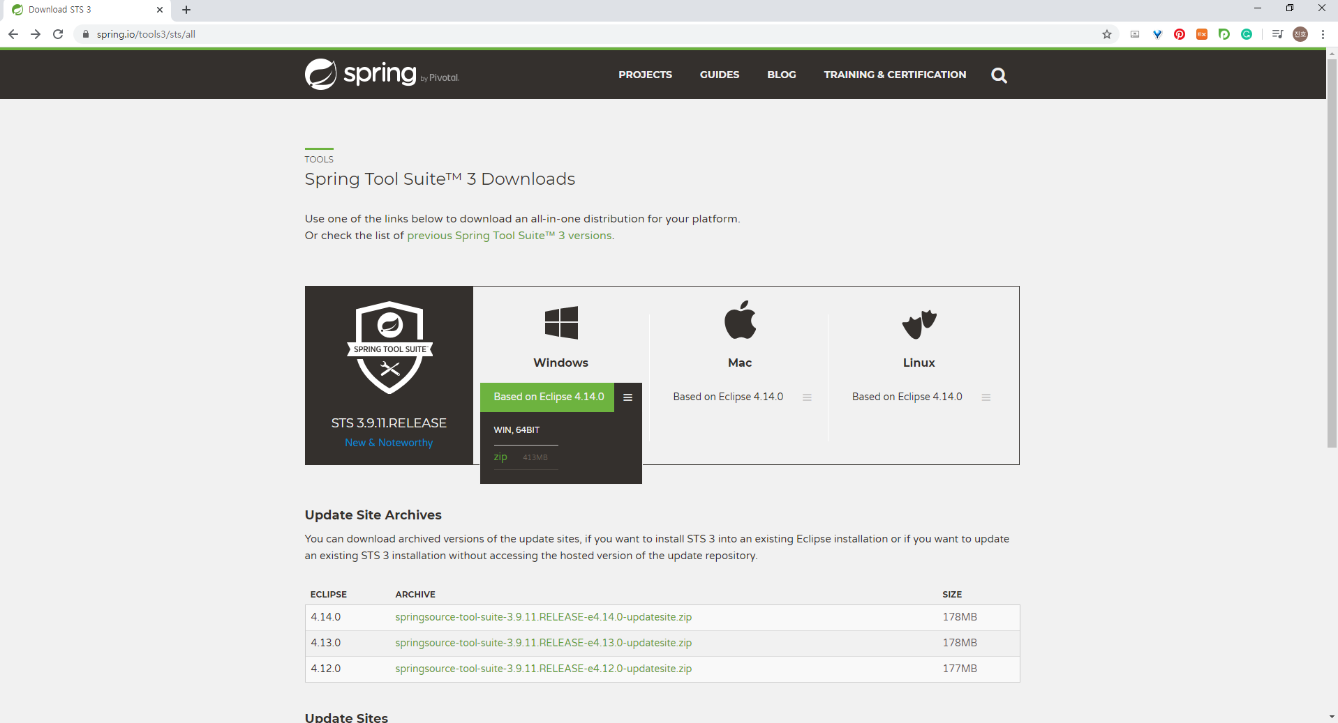 위 링크의 사이트를 방문하여 [Spring Tool Suite 3 Windows Version] 을 다운로드한다.