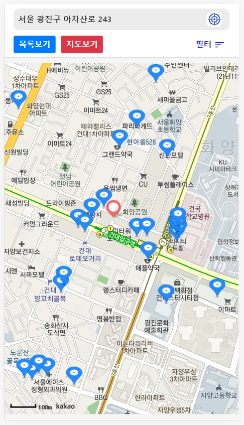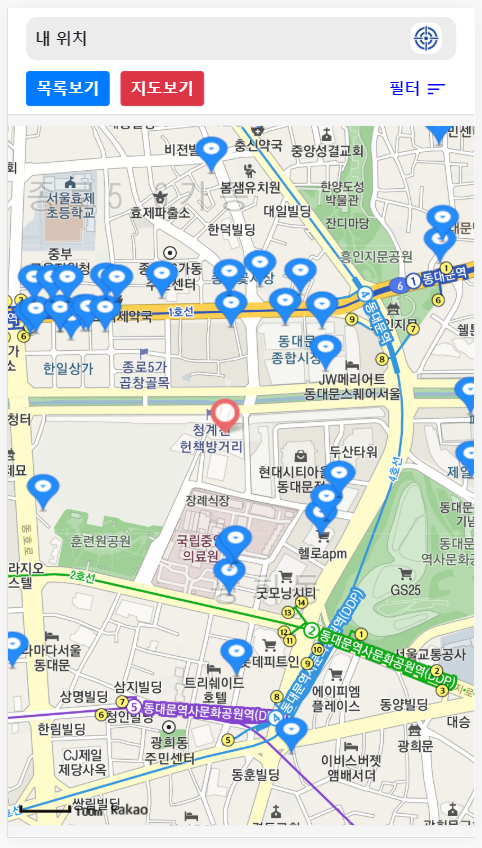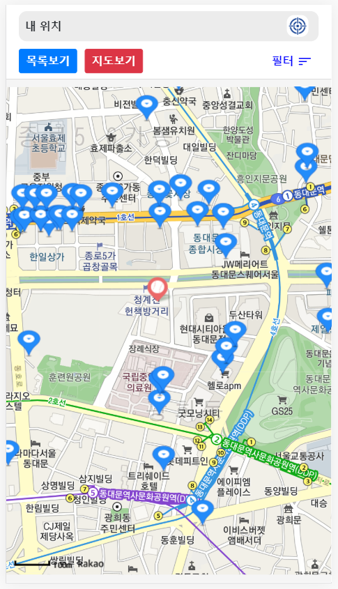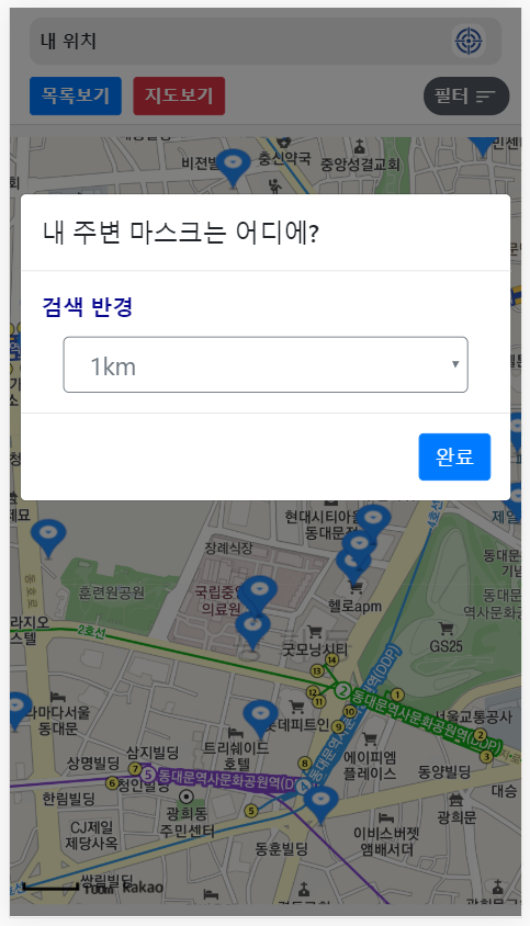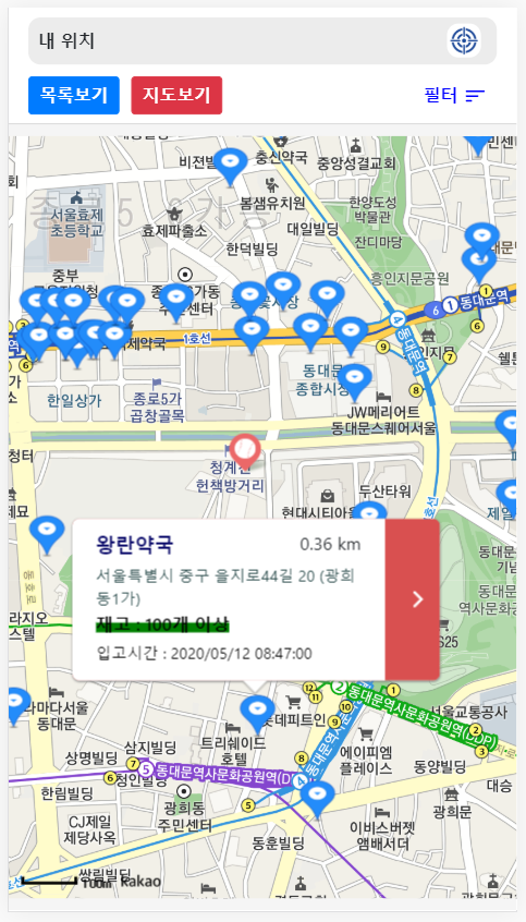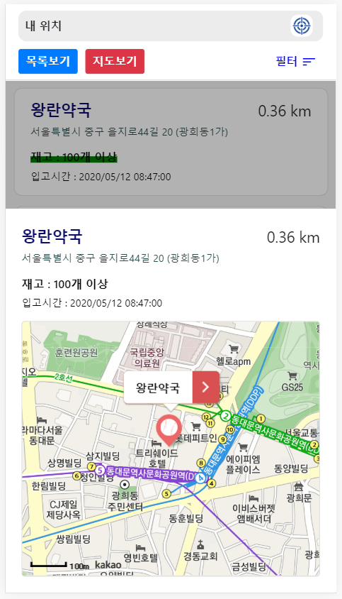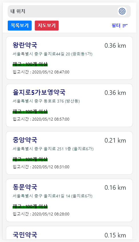 그리고 필터의 기능으로 거리 뿐만아니라 공적마스크 판매점 분류 및 재고에 따른 Visible 처리, List 에서 Order by 등의 기능도 추가 할 수 있었지만 서비스를 위한 개발이 아닌 리액트를 공부하는 상황에서 개발하는 것이었기에 급하게 마무리하게 되었습니다.